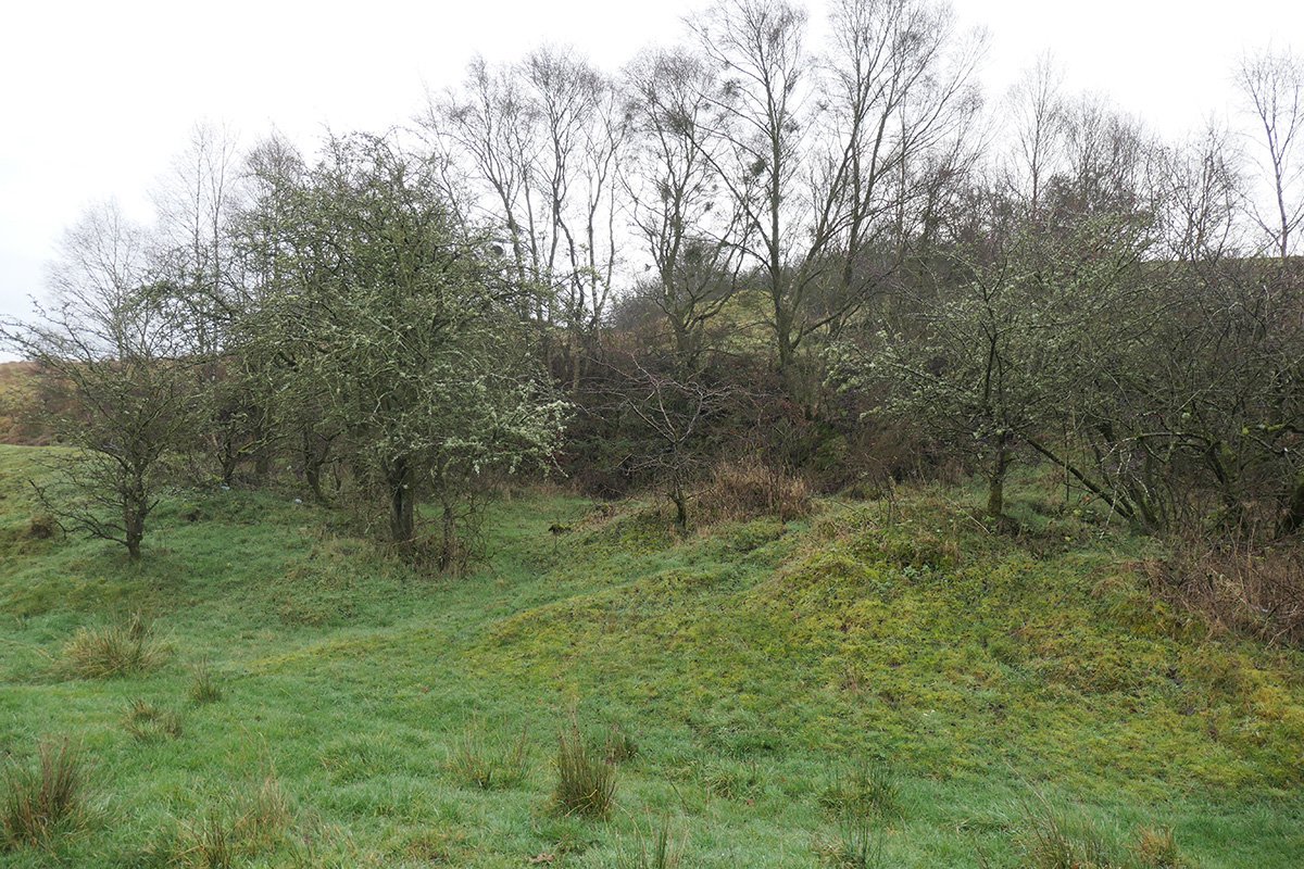 Much of what we know about these early coal workings is thanks to the enigmatic R Hynd-Brown who, in 1906, wrote a series of articles entitled “Armadale – Past and Present”. Hynd-Brown (perhaps this was a nom-de-plume?) seems to have had an encyclopedic first-hand knowledge of all things Armadale, stretching back to the dawn of the industrial age, when the town was no more than “a few red-tiled and straw-thatched, white-washed agricultural labourers' cottages”. Hynd-Brown tells of how, in about 1819, three local men formed the Boarbauchlaw Coal Company, which then sunk the Wood pit. He referred to the accounts of the company and provided interesting details of income, expenditure and men and women employed by the “Boarbauchlaw Coalrie”. Wood pit seems to have fallen derelict long before the first Ordnance Survey map in 1855, but the “old shaft” is clearly marked, and a nearby circular feature labelled “gin”. Here a horse harnessed to a lever would trudge on a circular path around a vertical shaft to turn the drum around which the haulage rope was wrapped. The rope passed over a wheel on a simple headframe to haul baskets of coal up the shaft. Hynd-Brown doesn't tell us the name of the gin-horse but informs us that it was supplied by William Brock of Barbauchlaw Mains farm at a cost of 13 shillings a week, An area of flat ground, perched on the very edge of the valley, still marks the site of the gin. The OS map also shows a track linking the pithead to the turnpike road, and a small rectangular structure marked “kiln”. The purpose of this is a bit of a mystery. Small quantities of ironstone would have been worked along with the coal and it was usual practice to process this by burning it in piles at the pithead. However it would seem most usual to construct a kiln for this purpose. A raised bank and hints of wall lines survive buried beneath the grass in this area.