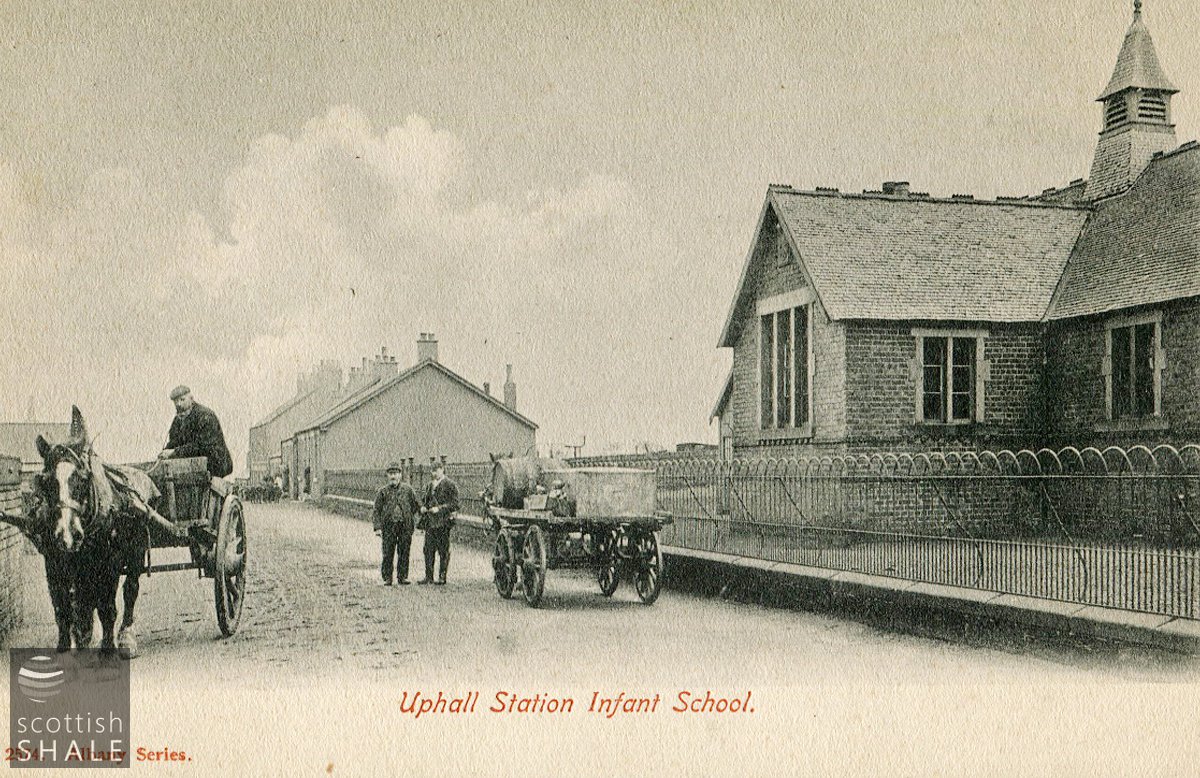 Postcard - "Uphall Station Infant School" B&W photographic printed postcard showing the school, housing next to the school and two horse and carts carrying goods in the foreground. c1905.