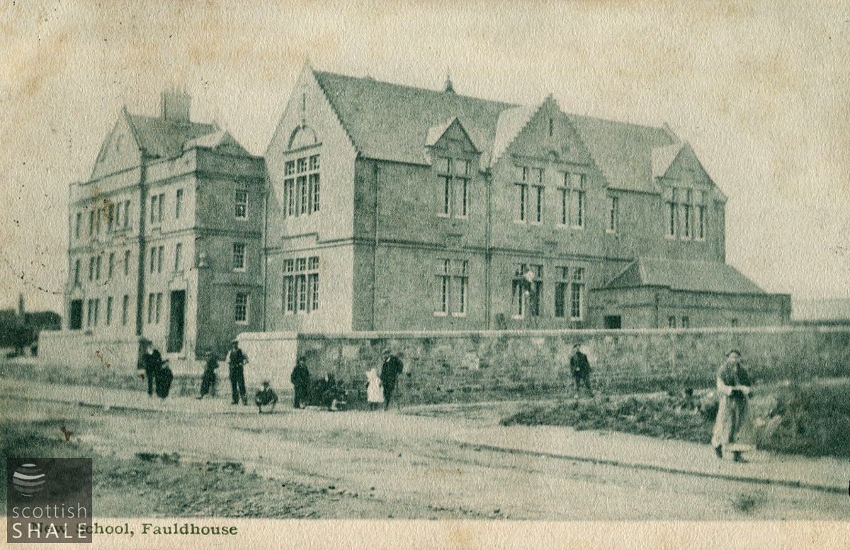Postcard - 'Public School, Fauldhouse' Black and white photographic postcard of the 'Public School, Fauldhouse'. A large group of children are gathered at the surrounding wall.