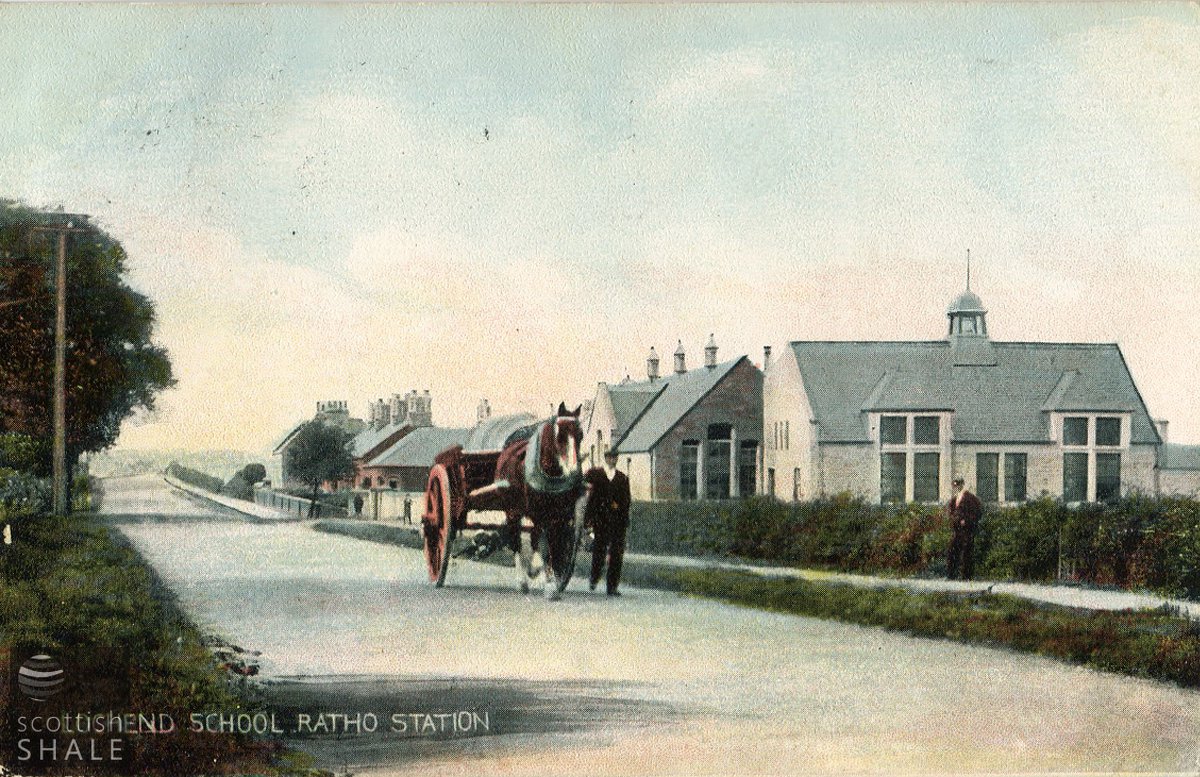 Postcard - "Lochend School, Ratho Station" Coloured printed postcard showing a horse-drawn soor milk cart passing Lochend School in Ratho Station.
