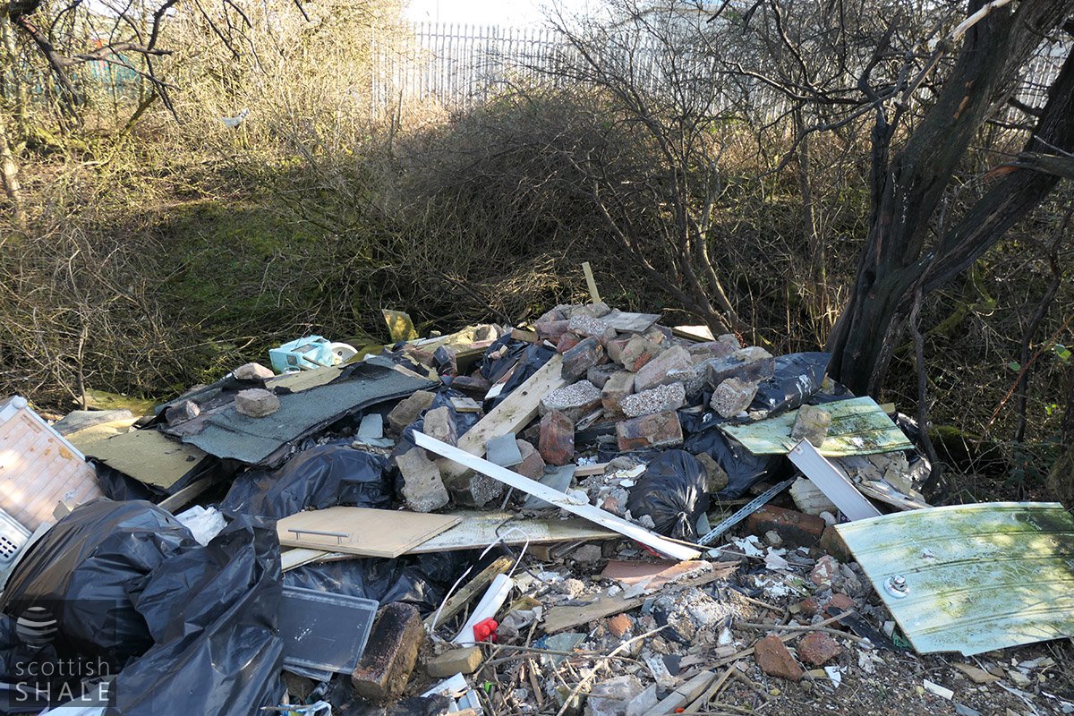 The Broxburn branch outlived the shale oil industry and was not closed by British Railways until about 1968. Much of the route can still be traced. At its eastern end, the line passes through part of the landscaped grounds of Newliston House that was cut-off and abandoned when the Edinburgh and Glasgow was built in the 1840's. Parts of this ornamental landscape are still evident. The line follows a wooded strip, giving views towards the Belvedere; a circular walled plantation that which must once have been a feature of a beautiful view from Newliston House. It then passes through the West Wood that marked the boundary of the estate, and boundary between the parishes of Kirkliston and Uphall. To the west, the line now forms the northern boundary of East Mains Industrial Estate. Rubbish is being dumped in the shallow cutting, the surrounding land has gone to waste and is now a playground for trail bikers. The railway bridge across canal disappeared some time around 2000 (if I remember correctly), but the route on the north side survives as roads and tracks serving the ramshackle group of industrial buildings that currently occupy the site of Albyn crude oil works.