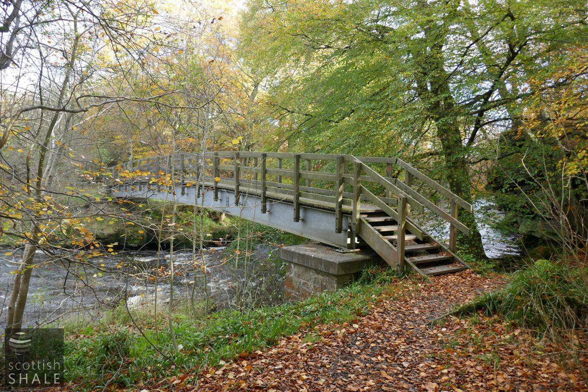 The rocky outcrop and natural arch of Wallace's cave was supposed by some to have been a hiding place of William Wallace following the battle of Falkirk. The first edition OS map, published in 1854 shows the “cave” on the Linlithgowshire bank of the river linked by a footbridge to the Avon Steel Works on the Stirlingshire side. The steel works were probably established early in the 19th century, and produced modest quantities of high quality tool steel using a process that involved heating iron in fireclay crucibles then hammering out impurities using large water-powered drop hammers. Production seemed to have ceased during the 1880's and the works gradually fell derelict. Avon cottages, once home to steel forge workers, continued to be inhabited into the 20th century.